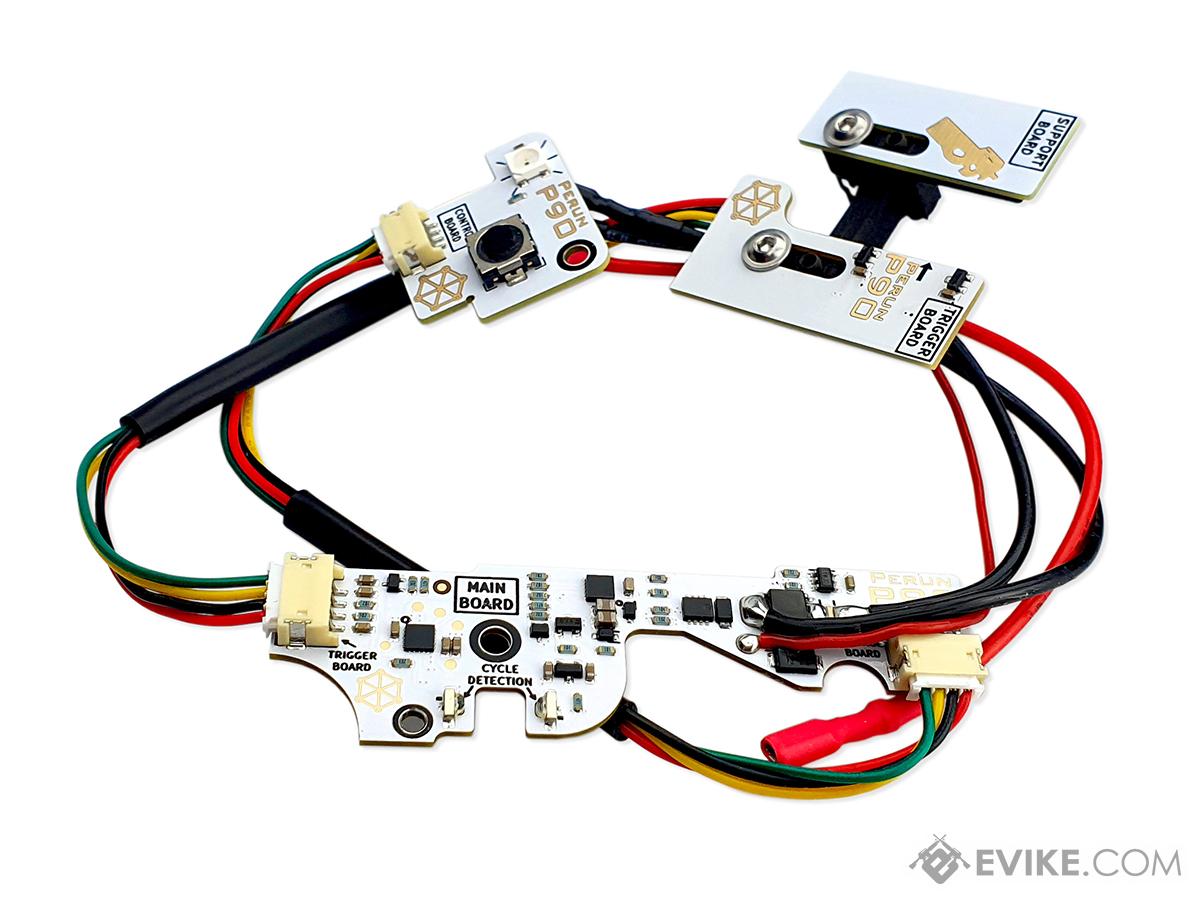 Perun for P90 replaces trigger bar and mechanical contacts in your P90 replica and provides lots of useful features. Magnetic sensors coupled with a magnet installed directly on the trigger, allow to remove the bar that connects trigger with the gearbox, making trigger pull much smoother. Proprietary cut-off lever (comes with the mosfet) works with an optical sensor to eliminate all problems with single fire function.