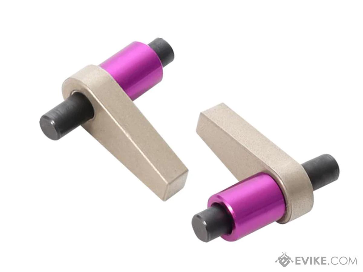 The anti-reversal latch are designed for Tokyo Marui Next Generation AEGs and High Cycle AEGs. The anti-reversal latch engages with the bevel gear to prevent the gear from reversing under the force of the main spring. This product utilizes chrome molybdenum steel for the shaft and sintered alloy for the latch, providing an excellent precise, smooth operation and durability in your gearbox.
